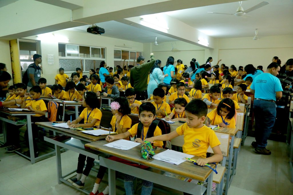 Children actively participate in a lively word problems workshop at Aristokids, showcasing their enthusiasm for learning. The classroom is filled with young learners engaged in educational activities, working diligently at their desks with colorful materials and worksheets. They collaborate with one another, solving problems and sharing ideas, while supervisors guide and support them throughout the session. The vibrant atmosphere reflects the dedication of Aristokids to fostering a creative and interactive educational environment, as seen on their website. https://aristokids.in/category/word-problems